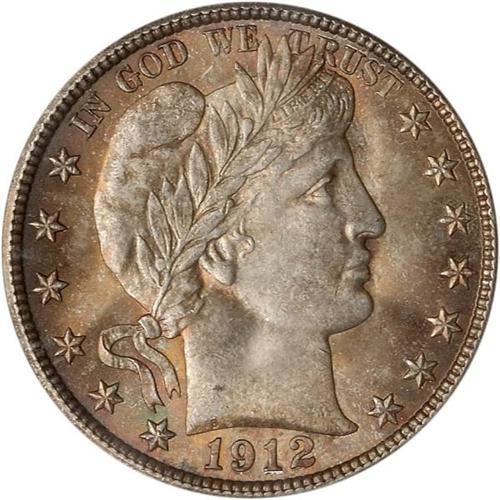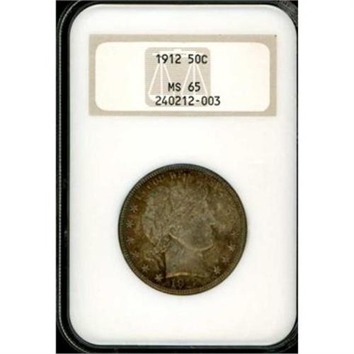 <b>1912 Barber Half Dollar. NGC graded MS65.</b> Silver to russet-brown cartwheel luster radiates from the thoroughly toned surfaces of this attractive coin. "Attractive" is too light-weight a word to describe its beauty. According to our observations, including the key highpoints of Liberty and the eagle, the strike is above-average, in fact sharp, in all areas <b>(PCGS # 6524)</b> <i>