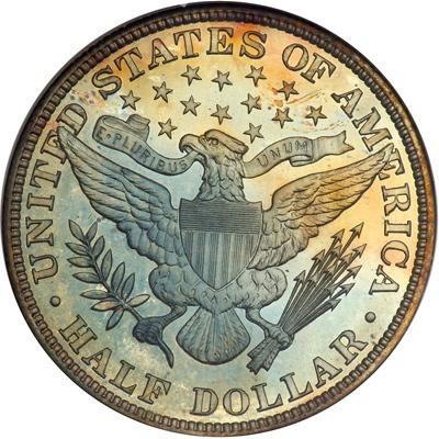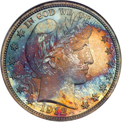 1912 Barber Half Dollar. NGC graded Proof 68. Intense rainbow toning on both sides. Only 700 Proofs issued. The majority of 1912 Proofs were handled as if by a wrecking crew going to work on a demolition site, and there seems to be little doubt that some of the coins may actually have been spent. These factors weigh on the surviving census, therefore, with few high quality coins left today. The surfaces of the Proof 68 on offer are nearly close to perfect. "Impressive" seems to be too weak a work to describe them. We would love to fill pages with descriptive adjectives about the coin, but won't. Briefly, the coin verges on Cameo Proof quality, as seen by the light satiny surface on the main devices. Toning is as expected with rich, deep, and thoroughly enjoyable shades. We expect that the successful bidder will let out an inner shout of joy when it is awarded (and if the people in the room sitting nearby lean over and listen closely, some of his elation may escape from his mouth, ears and nose in a snort of delight.) The question is: Who will be that successful bidder? Pop 6; none finer at NGC.
