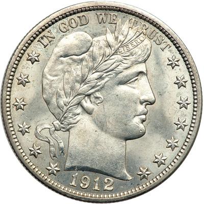 1912 Barber Half Dollar. PCGS graded MS-64. A few light slide marks on the cheek. Irreproachable in terms of surface preservation, both sides are thickly frosted and essentially tone-free (PCGS # 6524) .