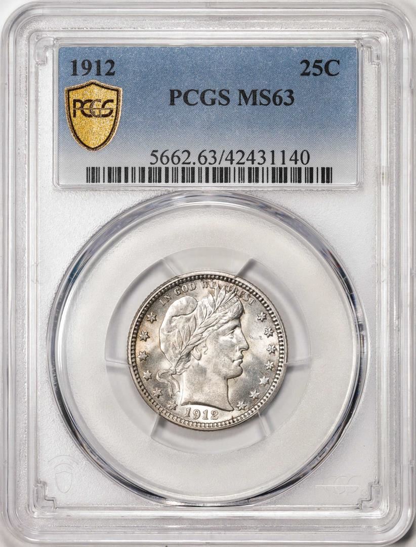 One 1912 Barber Quarter Coin PCGS MS63. PCGS Graded.