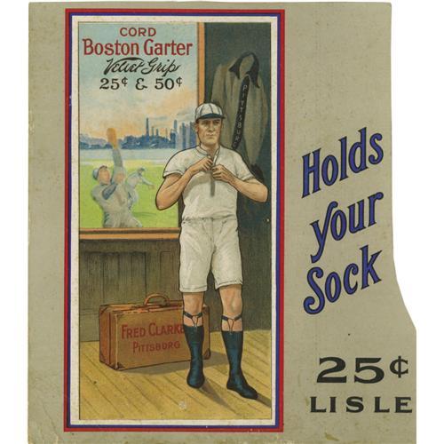 <B>1912 Boston Garter (H813) Advertising Sign Portion.</B></I> No other issue can boast a higher value per card than the sixteen-card set once distributed in boxes of sock garters almost a century ago. Book values list a common player at $24,000 in NM condition, with the Hall of Famers creeping close to, or beyond, the $30,000 mark. Surely this example of Pirates Hall of Famer Fred Clarke would merit something close to a NM rating if it were not for the fact it is affixed to a cardboard backing that was once a store display sign. Just the lightest hints of foxing speak to the card's advanced age. While the sign itself has been trimmed down to its present shape and size of approximately 7x9", the card remains untouched by the blade and shows none of the wear that appears in mild form at the edges of the cardboard mount. Those unfamiliar with this monumentally scarce issue will surely get a chuckle out of the "locker room with a view" theme, and the sight of the game's greatest players sporting the rather goofy looking product later rendered obsolete by the advent of elastic. Those brave souls who have undertaken the hobby of Boston Garter collecting must certainly understand that the chance to broaden one's collection comes along very rarely, and will jump at this opportunity. <BR><BR><B>Important notice:</B> Heritage usually auctions material at the rate of 200-250 lots per hour. On some occasions eBay Live bid software or the Internet may not be able to keep up with the pace of the auction. We recommend placing a realistic absentee bid now as insurance to avoid disappointment. Occasionally the auctioneer may eliminate or reject an eBay Live bid, and the auctioneer may also reopen a lot after the close of the eBay live bidding (usually because we missed an audience bid), and may reject your bid even if it shows you as the winning bidder. By bidding via eBay Live, you agree that Heritage may award the lot to another bidder at its sole discretion under the circumstances described above or any other reasonable circumstances. Since eBay bids are not shown to us until we open the lot on the floor, we treat those bids just like floor bids. In most cases the floor responds before the eBay bid is presented to us, due to Internet lag time, so for consistency we have made it a policy that floor bids are always considered first over tie eBay live bids. Also please note that all Heritage lots purchased through eBay Live carry a 22.5% Buyer's Premium. Please make sure you read the Terms and Conditions before you bid. This lot is being auctioned in conjunction with a live floor auction by Heritage Galleries & Auctioneers. All final auction and invoice information will be supplied by Heritage Galleries & Auctioneers, and all other information should be considered preliminary. Lot:19508 <BR><BR><B>Winning Notification and Billing:</B> After the FINAL session in this auction is complete, Heritage will send e-mail and snail mail invoices. This process normally takes several days. All final auction and invoice information will be supplied by Heritage Galleries & Auctioneers, and all other information should be considered preliminary. <BR><BR>This auction will be conducted on a live auction floor and over the Internet through eBay Live. If you choose to place an absentee bid, please take a moment to <font color='#0000ff'><u><a href='http://pages.ebay.com/liveauctions/help/before/laabsentee.html'>learn how eBay Live absentee bidding works</a></u></font><font color='#000000'>