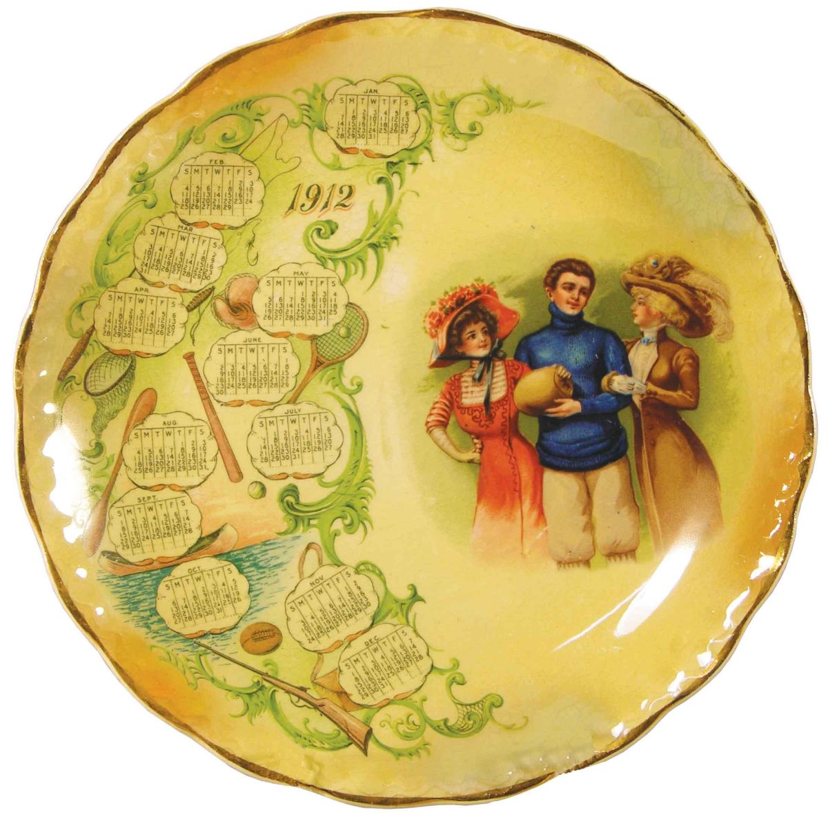 1912 Calendar Plate with sports theme, depicting hunting, fishing, baseball, tennis and football. Marked Carnation Mc Nicol. No chips or cracks. 8 1/4 inch diameter. Start Price $40