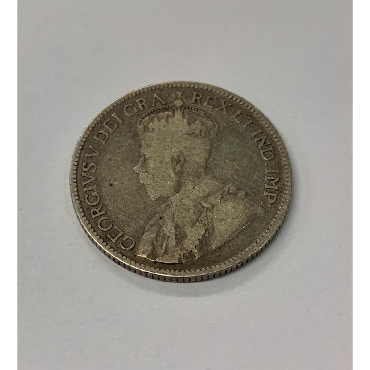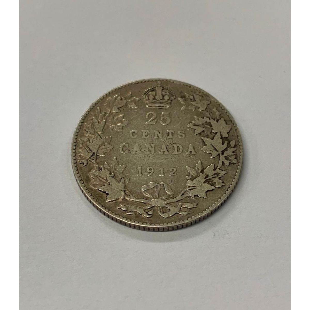 Obverse The portrait in left profile of George V is surrounded with the inscription "GEORGIVS V DEI GRA: REX ET IND:IMP" (George V, King and Emperor of India by the grace of God) Lettering: GEORGIVS V DEI GRA: REX ET IND:IMP: Reverse The facial value, accompanied with the inscription "CANADA", is surrounded with two maple boughs and a crown Lettering: 25 CENTS CANADA 1914 Features TypeStandard circulation coin Years1912-1919 Value25 Cents (0.25 CAD) MetalSilver (.925) Weight5.83 g Diameter23.62 mm Thickness1.45 mm ShapeRound OrientationMedal alignment ↑↑