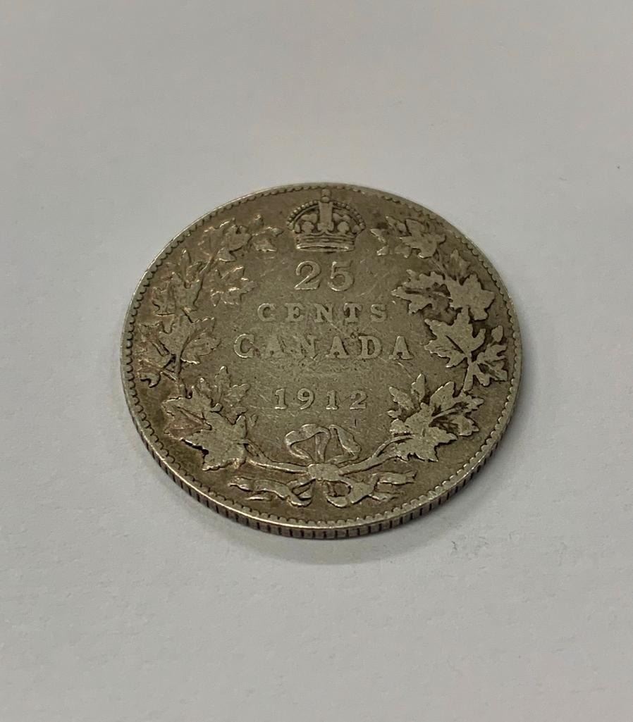 Obverse The portrait in left profile of George V is surrounded with the inscription "GEORGIVS V DEI GRA: REX ET IND:IMP" (George V, King and Emperor of India by the grace of God) Lettering: GEORGIVS V DEI GRA: REX ET IND:IMP: Reverse The facial value, accompanied with the inscription "CANADA", is surrounded with two maple boughs and a crown Lettering: 25 CENTS CANADA 1914 Features TypeStandard circulation coin Years1912-1919 Value25 Cents (0.25 CAD) MetalSilver (.925) Weight5.83 g Diameter23.62 mm Thickness1.45 mm ShapeRound OrientationMedal alignment ??