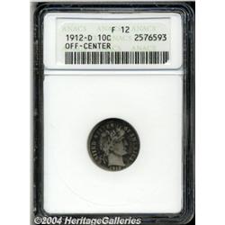 <B>1912-D<10C> Barber Dime--Struck 5% Off Center--Fine 12 ANACS.</B></I> Struck off center toward 6 o'clock. The design elements are toned a light gray, and show nice contrast with the darker gray fields. LIBERTY in the head band is strong, in line with generally nice detail throughout the obverse and most of the reverse, save for minor weakness in the upper portion of the wreath. A small abrasion is found in the obverse field just in front of Liberty's forehead, but is not readily apparent due to being toned over. <BR><BR><B>Important notice:</B> Heritage usually auctions material at the rate of 200-250 lots per hour. On some occasions eBay Live bid software or the Internet may not be able to keep up with the pace of the auction. We recommend placing a realistic absentee bid now as insurance to avoid disappointment. Occasionally the auctioneer may eliminate or reject an eBay Live bid, and the auctioneer may also reopen a lot after the close of the eBay live bidding (usually because we missed an audience bid), and may reject your bid even if it shows you as the winning bidder. By bidding via eBay Live, you agree that Heritage may award the lot to another bidder at its sole discretion under the circumstances described above or any other reasonable circumstances. Since eBay bids are not shown to us until we open the lot on the floor, we treat those bids just like floor bids. In most cases the floor responds before the eBay bid is presented to us, due to Internet lag time, so for consistency we have made it a policy that floor bids are always considered first over tie eBay live bids. Also please note that all Heritage lots purchased through eBay Live carry a 20% Buyer's Premium. Please make sure you read the Terms and Conditions before you bid.