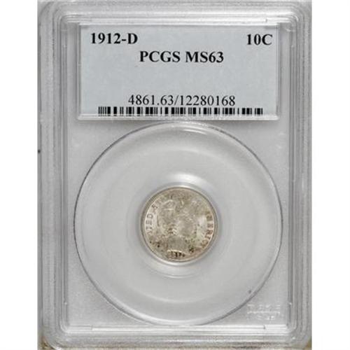 <B>1912-D 10C MS63 PCGS.</B></I> . PCGS Population (65/98). NGC Census: (46/93). Mintage: 11,760,000. Numismedia Wsl. Price for NGC/PCGS coin in MS63: $144. (#4861)<BR><BR><B>Coin Engraver:</B> Charles E. Barber<BR><BR><b>Shipping:</b> Coins & Currency (<a target="_blank" href="http://www.heritageauctions.com/common/shipping.php">view shipping information</a>)