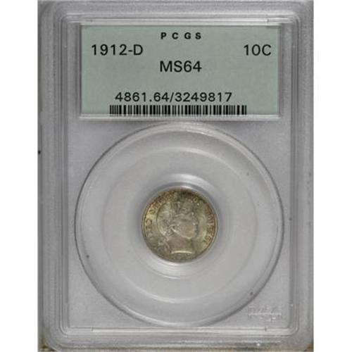 <B>1912-D 10C MS64 PCGS.</B></I> PCGS Population (64/34). NGC Census: (65/28). Mintage: 11,760,000. Numismedia Wsl. Price for NGC/PCGS coin in MS64: $260. (#4861)<BR><BR><B>Coin Engraver:</B> Charles E. Barber<BR><BR><b>Shipping:</b> Coins & Currency (<a target="_blank" href="http://www.heritageauctions.com/common/shipping.php">view shipping information</a>)