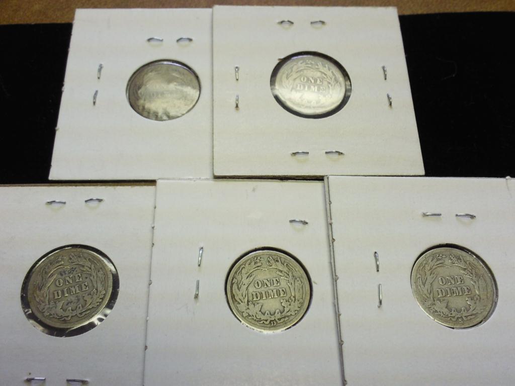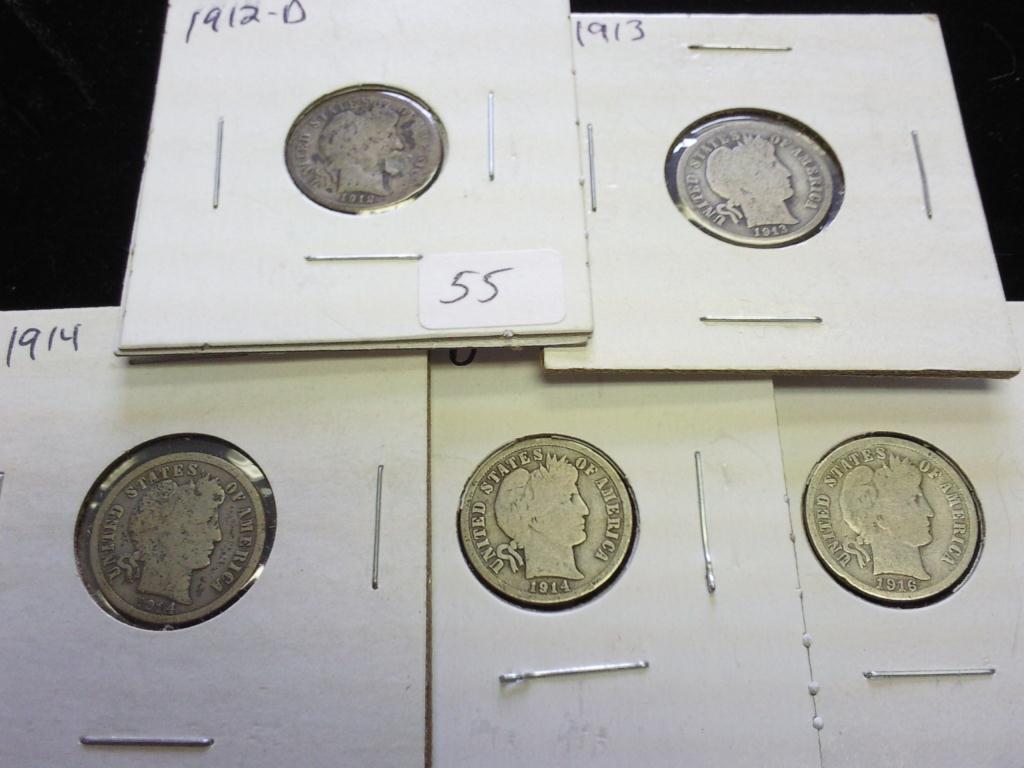 1912-D, 13, 14, 14-D & 16-S BARBER DIMES 5 COINS