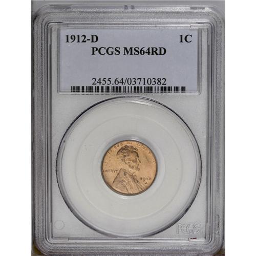 <B>1912-D<1C> MS64 Red PCGS.</B></I> Coppery-gold surfaces reveal a few light toning spots and flecks over each side. The design elements are well impressed throughout. <BR><BR><B>Important notice:</B> Heritage usually auctions material at the rate of 200-250 lots per hour. On some occasions eBay Live bid software or the Internet may not be able to keep up with the pace of the auction. We recommend placing a realistic absentee bid now as insurance to avoid disappointment. Occasionally the auctioneer may eliminate or reject an eBay Live bid, and the auctioneer may also reopen a lot after the close of the eBay live bidding (usually because we missed an audience bid), and may reject your bid even if it shows you as the winning bidder. By bidding via eBay Live, you agree that Heritage may award the lot to another bidder at its sole discretion under the circumstances described above or any other reasonable circumstances. Since eBay bids are not shown to us until we open the lot on the floor, we treat those bids just like floor bids. In most cases the floor responds before the eBay bid is presented to us, due to Internet lag time, so for consistency we have made it a policy that floor bids are always considered first over tie eBay live bids. Also please note that all Heritage lots purchased through eBay Live carry a 20% Buyer's Premium. Please make sure you read the Terms and Conditions before you bid. This lot is being auctioned in conjunction with a live floor auction by Heritage Galleries & Auctioneers. All final auction and invoice information will be supplied by Heritage Galleries & Auctioneers, and all other information should be considered preliminary. Lot:615 <BR><BR><B>Winning Notification and Billing:</B> After the FINAL session in this auction is complete, Heritage will send e-mail and snail mail invoices. This process normally takes several days. All final auction and invoice information will be supplied by Heritage Galleries & Auctioneers, and all other information should be considered preliminary. <BR><BR>This auction will be conducted on a live auction floor and over the Internet through eBay Live. If you choose to place an absentee bid, please take a moment to <font color='#0000ff'><u><a href='http://pages.ebay.com/liveauctions/help/before/laabsentee.html'>learn how eBay Live absentee bidding works</a></u></font><font color='#000000'>