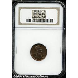 <B>1912-D<1C> MS66 Red NGC.</B></I> While relatively available in circulated grades, the '12-D Lincoln cent is very scarce in Mint State, and rare as a premium Gem. This coin is well struck with smooth, shimmering, matte-like surfaces that exhibit beautifully rich coloration and nearly perfect preservation. Very few examples from any of the early Lincoln cent issues will be found with merits that are comparable to those of the current offering. Population: 3 in 66 Red, 0 finer at either service (9/04). <BR><BR><B>Important notice:</B> Heritage usually auctions material at the rate of 200-250 lots per hour. On some occasions eBay Live bid software or the Internet may not be able to keep up with the pace of the auction. We recommend placing a realistic absentee bid now as insurance to avoid disappointment. Occasionally the auctioneer may eliminate or reject an eBay Live bid, and the auctioneer may also reopen a lot after the close of the eBay live bidding (usually because we missed an audience bid), and may reject your bid even if it shows you as the winning bidder. By bidding via eBay Live, you agree that Heritage may award the lot to another bidder at its sole discretion under the circumstances described above or any other reasonable circumstances. Since eBay bids are not shown to us until we open the lot on the floor, we treat those bids just like floor bids. In most cases the floor responds before the eBay bid is presented to us, due to Internet lag time, so for consistency we have made it a policy that floor bids are always considered first over tie eBay live bids. Also please note that all Heritage lots purchased through eBay Live carry a 20% Buyer's Premium. Please make sure you read the Terms and Conditions before you bid.