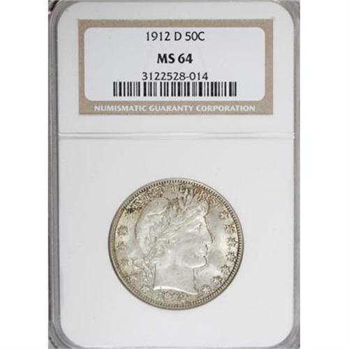 <B>1912-D 50C MS64 NGC.</B></I> A satiny and solidly struck example of this D-mint Barber half dollar issue, primarily silver-gray with elements of peach and charcoal at the margins. Minimally marked for the grade with excellent visual appeal.<BR><BR><B>Coin Engraver:</B> Charles E. Barber<BR><BR><b>Shipping:</b> Coins & Currency (<a target="_blank" href="http://www.heritageauctions.com/common/shipping.php">view shipping information</a>)