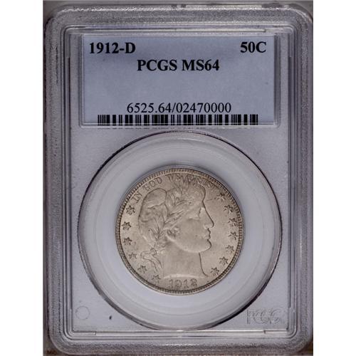 <B>1912-D<50C> MS64 PCGS.</B></I> Well struck except for a few of the obverse stars, with full satin luster and even pearl-gray toning. Just one or two small marks are evident on each of the two sides. A pleasing and conservatively graded near-Gem. Population: 91 in 64, 48 finer (2/06).