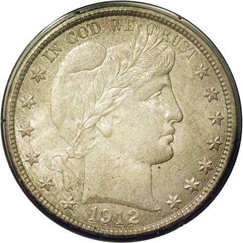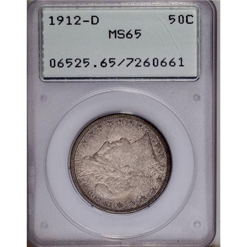<B>1912-D<50C> MS65 PCGS.</B></I> Sharply struck with charcoal-gray surfaces that reveal a light coating of speckled red-peach and blue-green patina, on both sides, under careful examination with a loupe. Lustrous and virtually blemish-free, this vibrant Gem is housed in a first-generation PCGS holder. Population: 39 in 65, 10 finer (3/06).