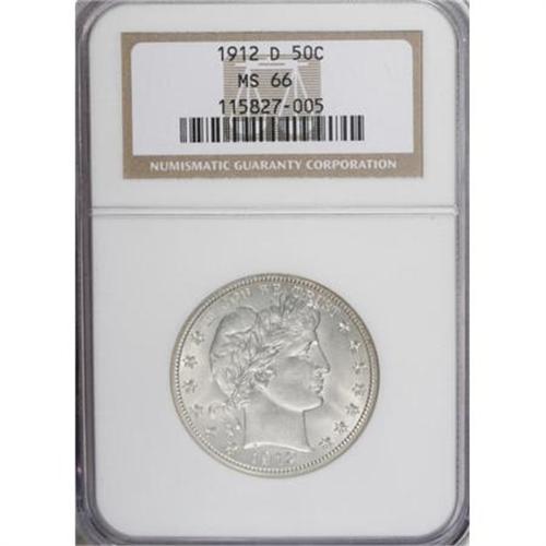 <B>1912-D 50C MS66 NGC.</B></I> This untoned Premium Gem has booming luster and remarkably smooth fields. The portrait is also surprisingly clean. The fletchings and the upper juncture of the right wing to the shield are a bit soft, as usual for the type. The 1912-D is a plentiful date in most grades, but emerges as a rarity at the MS66 level. Census: 5 in 66, 0 finer (6/07).<BR><I>From The Belle Glade Collection, Part Two.</B></I><BR><BR><B>Coin Engraver:</B> Charles E. Barber<BR><BR><b>Shipping:</b> Coins & Currency (<a target="_blank" href="http://www.heritageauctions.com/common/shipping.php">view shipping information</a>\)