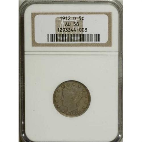 <B>1912-D 5C AU58 NGC.</B></I> NGC Census: (21/553). PCGS Population (44/599). Mintage: 8,474,000. Numismedia Wsl. Price for NGC/PCGS coin in AU58: $167. (#3874)<BR><BR><b>Shipping:</b> Coins & Currency (<a target="_blank" href="http://www.heritageauctions.com/common/shipping.php">view shipping information</a>)