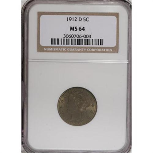 <B>1912-D 5C MS64 NGC.</B></I> This lovely branch mint emission offers deep olive-orange coloration on each side, with relatively pristine surfaces. Some of the right-side stars are softly struck, along with the lower wreath details, but there are few abrasions.<BR><BR><B>Coin Engraver:</B> Charles E. Barber<BR><BR><b>Shipping:</b> Coins & Currency (<a target="_blank" href="http://www.heritageauctions.com/common/shipping.php">view shipping information</a>)