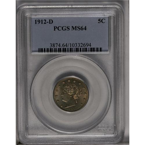 <B>1912-D<5C> MS64 PCGS.</B></I> Gray and gold toning covers the satiny surfaces. The strike shows the usual weakness in the hair, but the prime focal areas are almost completely free of marks. An attractive near-Gem coin.