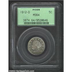 1912-D 5C MS64 PCGS. Sharply struck with much stronger luster than usually seen. Each side shows light golden and lilac patina.Ex: Tampa Bullet (Heritage, 11/92), lot 5152, where it brought $319.From the Ohio Collection. Important notice: We expect to be auctioning lots at the rate of 200-250 per hour. Sometimes eBay Premier live bid software cannot keep up with that pace, so we strongly recommend that you place a realistic proxy bid now as insurance to avoid disappointment. Also please note that all Heritage/CAA lots purchased through eBay Premier carry a 20% Buyer's Premium. Please make sure you read the Terms and Conditions.