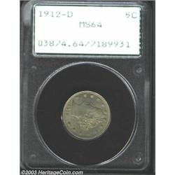 <TR><TD width="100%"><TABLE cellSpacing=1 cellPadding=3 width="100%" border=0><TBODY><TR><TD width="100%" bgColor=#79735c><FONT face=arial color=#ffffff size=3><B>Description</B> </FONT></TD></TR><TR><TD width="100%" bgColor=#ffffff><FONT face=arial size=2><B>1912-D 5C MS64 PCGS.</B></I> Wisps of chestnut-brown patina embrace the borders, while the centers generally have gunmetal-gray color. Not fully struck on the lower wreath, but a lustrous and impressively undisturbed near-Gem. </FONT></TD></TR></TBODY></TABLE></TD></TR></TBODY></TABLE><BR><A name=PricesRealized></A><TABLE cellSpacing=0 cellPadding=0 width="100%" bgColor=#000000 border=0><TBODY><TR><TD width="100%"><TABLE cellSpacing=1 cellPadding=3 width="100%" border=0><TBODY><TR><TD width="100%" bgColor=#79735c><A name=PR><FONT face=arial color=#ffffff size=3><B>Previous Prices from Heritage Auctions</B> </FONT></A></TD></TR><TR><TD bgColor=#f6f6ed><TABLE cellSpacing=0 cellPadding=0 width="100%" border=1><TBODY><TR><TD align=middle width="33%"><B>Date</B></TD><TD align=middle width="33%"><B>Service</B></TD><TD align=middle width="33%"><B>Price</B></TD></TR><TR bgColor=whitesmoke><TD width="33%"><B>03/01/2003</B></TD><TD width="33%">NGC</TD><TD width="33%">$310.50</TD></TR><TR bgColor=whitesmoke><TD width="33%"><B>05/31/2003</B></TD><TD width="33%">NGC</TD><TD width="33%">$391.00</TD></TR><TR bgColor=whitesmoke><TD width="33%"><B>01/13/2003</B></TD><TD width="33%">NGC</TD><TD width="33%">$348.45</TD></TR><TR bgColor=whitesmoke><TD width="33%"><B>09/28/2002</B></TD><TD width="33%">NGC</TD><TD width="33%">$517.50</TD></TR><TR bgColor=whitesmoke><TD width="33%"><B>04/28/2002</B></TD><TD width="33%">NGC</TD><TD width="33%">$603.75</TD></TR><TR bgColor=whitesmoke><TD width="33%"><B>04/07/2001</B></TD><TD width="33%">NGC</TD><TD width="33%">$281.75</TD></TR><TR bgColor=whitesmoke><TD width="33%"><B>10/04/1997</B></TD><TD width="33%">NGC</TD><TD width="33%">$253.00</TD></TR><TR bgColor=whitesmoke><TD width="33%"><B>07/31/1993</B></TD><TD width="33%">NGC</TD><TD width="33%">$220.00</TD></TR><TR bgColor=whitesmoke><TD width="33%"><B>06/01/1996</B></TD><TD width="33%">NGC</TD><TD width="33%">$308.00</TD></TR><TR bgColor=whitesmoke><TD width="33%"><B>11/23/2002</B></TD><TD width="33%">PCGS</TD><TD width="33%">$517.50</TD></TR><TR bgColor=whitesmoke><TD width="33%"><B>04/23/2002</B></TD><TD width="33%">PCGS</TD><TD width="33%">$379.50</TD></TR><TR bgColor=whitesmoke><TD width="33%"><B>11/15/2001</B></TD><TD width="33%">PCGS</TD><TD width="33%">$546.25</TD></TR><TR bgColor=whitesmoke><TD width="33%"><B>12/05/2000</B></TD><TD width="33%">PCGS</TD><TD width="33%">$310.00</TD></TR><TR bgColor=whitesmoke><TD width="33%"><B>01/11/2003</B></TD><TD width="33%">ANACS</TD><TD width="33%">$448.50</TD></TR></TBODY></TABLE></TD></TR><TR><TD bgColor=#ffffff><FONT face=arial size=1 ?>PLEASE NOTE: All prices realized reflect the final hammer price PLUS the buyer's premium in auctions that charge a buyer's premium. Each item has a notation at the top of the listing indicating whether that lot included a buyer's premium. Example: A item that sells with a final hammer price of $100 and a 20% buyer's premium will display with a price realized of $120. All information listed is intended to be as accurate as possible, but errors are possible. Please use this guide carefully and inform us of any inaccuracies. </FONT></TD></TR></TBODY></TABLE></TD></TR></TBODY></TABLE><BR><TABLE cellSpacing=0 cellPadding=0 width="100%" bgColor=#000000 border=0><TBODY><TR><TD width="100%"><TABLE cellSpacing=1 cellPadding=3 width="100%" border=0><TBODY><TR><TD width="100%" bgColor=#79735c colSpan=6><FONT face=arial color=#ffffff size=3><B>Price Guide*</B> </FONT></TD></TR><TR bgColor=#f6f6ed><TD align=middle><B>Grade</B> </TD><TD align=middle><B>Coin World<BR>(Trends)</B> </TD><TD align=middle><B>Numismedia<BR>Retail</B> </TD><TD align=middle><B>Numismedia<BR>Wholesale</B> </TD><TD align=middle><B>Coin<BR>Universe</B> </TD><TD align=middle><B>Heritage<BR>Value Index</B> </TD></TR><TR bgColor=#ffffff><TD align=middle>63</TD><TD align=right>$350.00</TD><TD align=right>$350.00</TD><TD align=right>$292.00</TD><TD align=right>$335.00</TD><TD align=right>$220.38</TD></TR><TR style="FONT-WEIGHT: bold" bgColor=#cccfdd><TD align=middle>64</TD><TD align=right>$450.00</TD><TD align=right>$540.00</TD><TD align=right>$432.00</TD><TD align=right>$465.00</TD><TD align=right>$335.19</TD></TR><TR bgColor=#ffffff><TD align=middle>65</TD><TD align=right>$1,500.00</TD><TD align=right>---</TD><TD align=right>$875.00</TD><TD align=right>$1,150.00</TD><TD align=right>$1,003.75</TD></TR><TR bgColor=#ffffff><TD colSpan=6><FONT size=1>*All information listed is intended to be as accurate as possible, but errors are possible. No item may be returned or refused based on this information which is provided as a service to our customers. You should contact each pricing source directly to determine the accuracy of this information. </FONT></TD></TR></TBODY></TABLE></TD></TR></TBODY></TABLE><BR><TABLE cellSpacing=0 cellPadding=0 width="100%" bgColor=#000000 border=0><TBODY><TR><TD width="100%"><TABLE cellSpacing=1 cellPadding=3 width="100%" border=0><TBODY><TR><TD width="100%" bgColor=#79735c><FONT face=arial color=#ffffff size=3><B>Population Guide</B> </FONT></TD></TR><TR bgColor=#ffffff><TD align=middle><!-- Begin Output of Population Grid--><TABLE cellSpacing=0 cellPadding=0 width="100%" border=0><TBODY><TR><TD vAlign=center><TABLE cellSpacing=0 width="100%" border=1 cellsadding="3"><TBODY><TR><TD vAlign=center><TABLE cellSpacing=0 cellPadding=3 width="100%" border=1><TBODY><TR><TD vAlign=center align=middle bgColor=#f0f1e8 colSpan=2 <CENTER><FONT face=Arial size=2><B>PCGS Pop </B></FONT><CENTER></CENTER></TD><TD vAlign=center align=middle bgColor=#f0f1e8 colSpan=2><CENTER><FONT face=Arial size=2><B>NGC Pop</B></CENTER></FONT></TD></TR><TR><TD vAlign=center><FONT face=Arial size=2>(64)</FONT> </TD><TD vAlign=cente