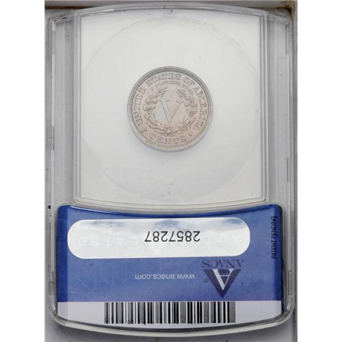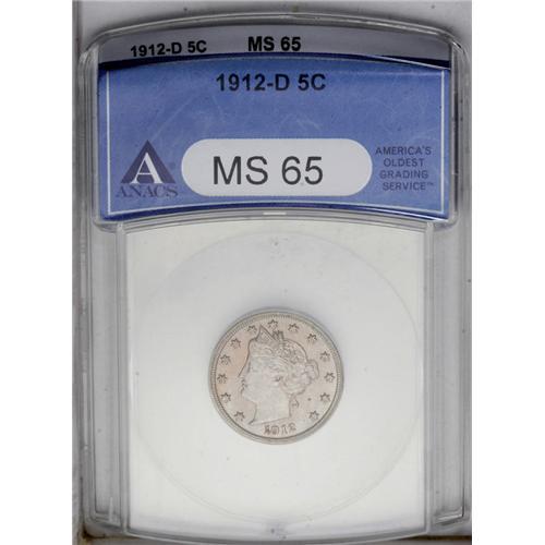 <B>1912-D<5C> MS65 ANACS.</B></I> A satiny Gem with intermingled gray and violet color, typical of high quality survivors from the only Denver Mint Liberty nickel issue. The obverse has a few tiny spots and a small freckle of gold toning at the 19 of the date.