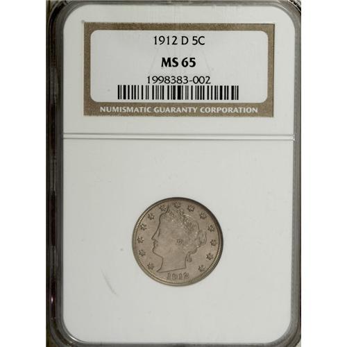 <B>1912-D 5C MS65 NGC.</B></I> Most of the design elements are well articulated, but the obverse stars and the reverse left ear of corn display typical minor weakness. Pleasing gray-gold toning covers each side, and the fields exhibit cartwheel luster; an unusual effect for any Liberty nickel issue. The surfaces are immaculately preserved. Census: 75 in 65, 27 finer (11/06).<BR><BR><b>Shipping:</b> Coin/Currency (<a target="_blank" href="http://www.heritageauctions.com/common/shipping.php">view shipping information</a>)