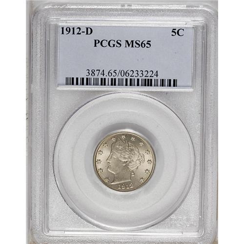 <B>1912-D<5C> MS65 PCGS.</B></I> Nicely struck for this branch mint issue and quite lustrous. Pale rose, lavender, and gold patina covers both sides, though a couple dark spots appear on the obverse. Although San Francisco struck base metal coins as early as 1908, Denver did not strike cents until 1911, and nickels waited until 1912.
