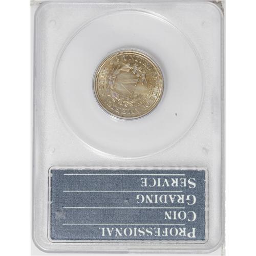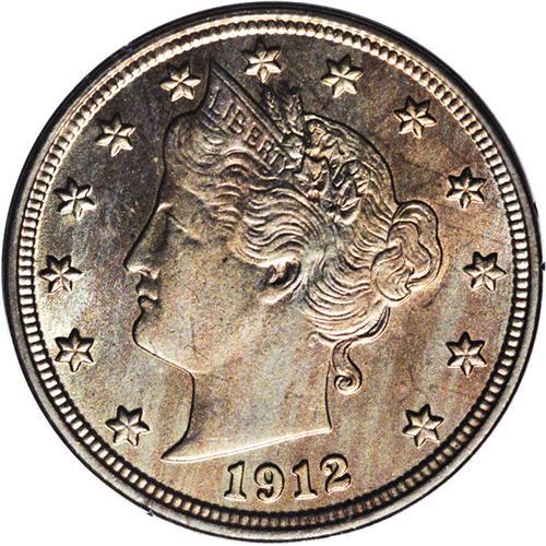 <B>1912-D<5C> MS65 PCGS.</B></I> Red-orange toning streaks overlay the mint-green surfaces on each side of the coin. This piece is decently struck, showing only minor softness on the obverse stars and the reverse left ear of corn. As the only D-mint issue in the series, the 1912-D Liberty nickel is a desirable coin for type purposes. Housed in a first-generation PCGS holder.
