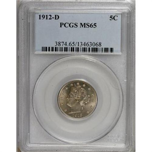 <B>1912-D 5C MS65 PCGS.</B></I> The "other" branch mint Liberty Head nickel, the 1912-D is not so prominent as its S-mint counterpart, yet the issue has its own charms. This subtly lustrous, well-defined example has splashes of peach patina over the fields.<BR><BR><B>Coin Engraver:</B> Charles E. Barber<BR><BR><b>Shipping:</b> Coins & Currency (<a target="_blank" href="http://www.heritageauctions.com/common/shipping.php">view shipping information</a>)