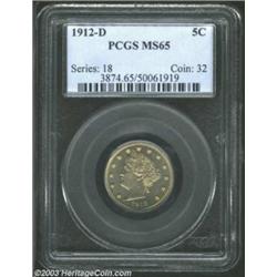 <TABLE cellSpacing=0 cellPadding=0 width="100%" bgColor=#000000 border=0><TBODY><TR><TD width="100%"><TABLE cellSpacing=1 cellPadding=3 width="100%" border=0><TBODY><TR><TD width="100%" bgColor=#79735c><FONT face=arial color=#ffffff size=3><B>Description</B> </FONT></TD></TR><TR><TD width="100%" bgColor=#ffffff><FONT face=arial size=2><B>1912-D 5C MS65 PCGS.</B></I> A light sheath of gold and rose patina delicately graces the surfaces of this well struck and light abraded Gem nickel. Eye appeal such as the kind held by this coin is frequently seen only in higher grades of Gem preservation. Population: 63 in 65, 15 finer (8/03). </FONT></TD></TR></TBODY></TABLE></TD></TR></TBODY></TABLE><BR><A name=PricesRealized></A><TABLE cellSpacing=0 cellPadding=0 width="100%" bgColor=#000000 border=0><TBODY><TR><TD width="100%"><TABLE cellSpacing=1 cellPadding=3 width="100%" border=0><TBODY><TR><TD width="100%" bgColor=#79735c><A name=PR><FONT face=arial color=#ffffff size=3><B>Previous Prices from Heritage Auctions</B> </FONT></A></TD></TR><TR><TD bgColor=#f6f6ed><TABLE cellSpacing=0 cellPadding=0 width="100%" border=1><TBODY><TR><TD align=middle width="33%"><B>Date</B></TD><TD align=middle width="33%"><B>Service</B></TD><TD align=middle width="33%"><B>Price</B></TD></TR><TR bgColor=whitesmoke><TD width="33%"><B>05/31/2003</B></TD><TD width="33%">PCGS</TD><TD width="33%">$1,495.00</TD></TR><TR bgColor=whitesmoke><TD width="33%"><B>08/06/2003</B></TD><TD width="33%">PCGS</TD><TD width="33%">$1,265.00</TD></TR><TR bgColor=whitesmoke><TD width="33%"><B>11/23/2002</B></TD><TD width="33%">PCGS</TD><TD width="33%">$1,265.00</TD></TR><TR bgColor=whitesmoke><TD width="33%"><B>02/23/2002</B></TD><TD width="33%">PCGS</TD><TD width="33%">$1,035.00</TD></TR><TR bgColor=whitesmoke><TD width="33%"><B>01/01/1995</B></TD><TD width="33%">PCGS</TD><TD width="33%">$605.00</TD></TR><TR bgColor=whitesmoke><TD width="33%"><B>08/01/1995</B></TD><TD width="33%">PCGS</TD><TD width="33%">$605.00</TD></TR><TR bgColor=whitesmoke><TD width="33%"><B>01/01/1996</B></TD><TD width="33%">PCGS</TD><TD width="33%">$825.00</TD></TR><TR bgColor=whitesmoke><TD width="33%"><B>03/01/1999</B></TD><TD width="33%">PCGS</TD><TD width="33%">$748.00</TD></TR><TR bgColor=whitesmoke><TD width="33%"><B>04/05/2001</B></TD><TD width="33%">PCGS</TD><TD width="33%">$777.40</TD></TR><TR bgColor=whitesmoke><TD width="33%"><B>09/28/2002</B></TD><TD width="33%">NGC</TD><TD width="33%">$776.25</TD></TR><TR bgColor=whitesmoke><TD width="33%"><B>09/28/2002</B></TD><TD width="33%">NGC</TD><TD width="33%">$920.00</TD></TR><TR bgColor=whitesmoke><TD width="33%"><B>07/30/2002</B></TD><TD width="33%">NGC</TD><TD width="33%">$816.50</TD></TR><TR bgColor=whitesmoke><TD width="33%"><B>09/01/1997</B></TD><TD width="33%">NGC</TD><TD width="33%">$688.00</TD></TR><TR bgColor=whitesmoke><TD width="33%"><B>03/19/1997</B></TD><TD width="33%">NGC</TD><TD width="33%">$704.00</TD></TR><TR bgColor=whitesmoke><TD width="33%"><B>10/06/2000</B></TD><TD width="33%">ANACS</TD><TD width="33%">$529.00</TD></TR></TBODY></TABLE></TD></TR><TR><TD bgColor=#ffffff><FONT face=arial size=1 ?>PLEASE NOTE: All prices realized reflect the final hammer price PLUS the buyer's premium in auctions that charge a buyer's premium. Each item has a notation at the top of the listing indicating whether that lot included a buyer's premium. Example: A item that sells with a final hammer price of $100 and a 20% buyer's premium will display with a price realized of $120. All information listed is intended to be as accurate as possible, but errors are possible. Please use this guide carefully and inform us of any inaccuracies. </FONT></TD></TR></TBODY></TABLE></TD></TR></TBODY></TABLE><BR><TABLE cellSpacing=0 cellPadding=0 width="100%" bgColor=#000000 border=0><TBODY><TR><TD width="100%"><TABLE cellSpacing=1 cellPadding=3 width="100%" border=0><TBODY><TR><TD width="100%" bgColor=#79735c colSpan=6><FONT face=arial color=#ffffff size=3><B>Price Guide*</B> </FONT></TD></TR><TR bgColor=#f6f6ed><TD align=middle><B>Grade</B> </TD><TD align=middle><B>Coin World<BR>(Trends)</B> </TD><TD align=middle><B>Numismedia<BR>Retail</B> </TD><TD align=middle><B>Numismedia<BR>Wholesale</B> </TD><TD align=middle><B>Coin<BR>Universe</B> </TD><TD align=middle><B>Heritage<BR>Value Index</B> </TD></TR><TR bgColor=#ffffff><TD align=middle>64</TD><TD align=right>$450.00</TD><TD align=right>$540.00</TD><TD align=right>$432.00</TD><TD align=right>$465.00</TD><TD align=right>$335.19</TD></TR><TR style="FONT-WEIGHT: bold" bgColor=#cccfdd><TD align=middle>65</TD><TD align=right>$1,500.00</TD><TD align=right>---</TD><TD align=right>$875.00</TD><TD align=right>$1,150.00</TD><TD align=right>$982.50</TD></TR><TR bgColor=#ffffff><TD align=middle>66</TD><TD align=right>$3,000.00</TD><TD align=right>---</TD><TD align=right>$1,625.00</TD><TD align=right>$3,400.00</TD><TD align=right>$2,451.67</TD></TR><TR bgColor=#ffffff><TD colSpan=6><FONT size=1>*All information listed is intended to be as accurate as possible, but errors are possible. No item may be returned or refused based on this information which is provided as a service to our customers. You should contact each pricing source directly to determine the accuracy of this information. </FONT></TD></TR></TBODY></TABLE></TD></TR></TBODY></TABLE><BR><TABLE cellSpacing=0 cellPadding=0 width="100%" bgColor=#000000 border=0><TBODY><TR><TD width="100%"><TABLE cellSpacing=1 cellPadding=3 width="100%" border=0><TBODY><TR><TD width="100%" bgColor=#79735c><FONT face=arial color=#ffffff size=3><B>Population Guide</B> </FONT></TD></TR><TR bgColor=#ffffff><TD align=middle><!-- Begin Output of Population Grid--><TABLE cellSpacing=0 cellPadding=0 width="100%" border=0><TBODY><TR><TD vAlign=center><TABLE cellSpacing=0 width="100%" border=1 cellsadding="3"><TBODY><TR><TD vAlign=center><TABLE cellSpacing=0 cellPadding=3 width="100%" border=1><TBODY><TR><TD vAlign=center align=middle bgColor=#f0f1e8 colSpan=2 <CE