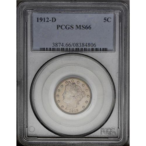 <B>1912-D<5C> MS66 PCGS.</B></I> A light coating of golden-gray patina delicately graces the surfaces of this well struck and lightly abraded Gem Liberty nickel. Eye appeal such as the kind held by this coin is frequently seen only in higher grades of preservation. Population: 24 in 66, 0 finer (3/06), three are finer at NGC. <BR><BR><B>Important notice:</B> Heritage usually auctions material at the rate of 200-250 lots per hour. On some occasions eBay Live bid software or the Internet may not be able to keep up with the pace of the auction. We recommend placing a realistic absentee bid now as insurance to avoid disappointment. Occasionally the auctioneer may eliminate or reject an eBay Live bid, and the auctioneer may also reopen a lot after the close of the eBay live bidding (usually because we missed an audience bid), and may reject your bid even if it shows you as the winning bidder. By bidding via eBay Live, you agree that Heritage may award the lot to another bidder at its sole discretion under the circumstances described above or any other reasonable circumstances. Since eBay bids are not shown to us until we open the lot on the floor, we treat those bids just like floor bids. In most cases the floor responds before the eBay bid is presented to us, due to Internet lag time, so for consistency we have made it a policy that floor bids are always considered first over tie eBay live bids. Also please note that all Heritage lots purchased through eBay Live carry a 20% Buyer's Premium. Please make sure you read the Terms and Conditions before you bid. This lot is being auctioned in conjunction with a live floor auction by Heritage Galleries & Auctioneers. All final auction and invoice information will be supplied by Heritage Galleries & Auctioneers, and all other information should be considered preliminary. Lot:970 <BR><BR><B>Winning Notification and Billing:</B> After the FINAL session in this auction is complete, Heritage will send e-mail and snail mail invoices. This process normally takes several days. All final auction and invoice information will be supplied by Heritage Galleries & Auctioneers, and all other information should be considered preliminary. <BR><BR>This auction will be conducted on a live auction floor and over the Internet through eBay Live. If you choose to place an absentee bid, please take a moment to <font color='#0000ff'><u><a href='http://pages.ebay.com/liveauctions/help/before/laabsentee.html'>learn how eBay Live absentee bidding works</a></u></font><font color='#000000'>