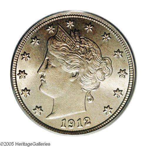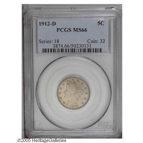 <B>1912-D<5C> MS66 PCGS.</B></I> Bright and lustrous for this date and Mint, with a hint of light gold on the obverse. The strike is sharp on the obverse stars, Liberty and the wreath save for the lower left corn ear, which is soft. Traces of carbon specks can be counted on one hand, placing the present example head and shoulders above most other known specimens. One of the finest seen by PCGS, and a perfect coin to round out a specialist's date collection. Population: 23 in 66, 0 finer (12/05).