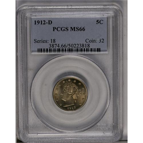<B>1912-D<5C> MS66 PCGS.</B></I> The '12-D is always popular as the single D-mint issue in the series and, at this outstanding grade level, is legitimately scarce as well. Both sides have a smooth, satiny appearance beneath light golden patina. A couple of lower left stars and the left ear of corn show minor striking softness, as usual for the issue. A tiny dark spot under the 2 on the obverse rim serves as a pedigree identifier. Population: 26 in 66, 0 finer (6/06).