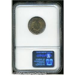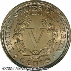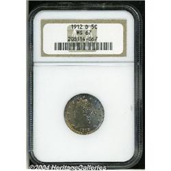 <B>1912-D<5C> MS67 NGC.</B></I> Impeccably preserved, satiny surfaces with a variegated overlay of sky-blue and reddish-orange patina interwoven over both sides. Nicely struck overall, with only appreciable softness found only on the right obverse stars (also the scene of the semi-circular die break that extends to the date) and on the left kernel of corn on the wreath. A few minute carbon flecks to the left of the portrait would not even be mentioned on a lesser-grade piece. Easily one of the finest and surely the prettiest '12-D Nickels we have offered in recent memory. Population: 3 in 67, 0 finer (9/04). <BR><BR><B>Important notice:</B> Heritage usually auctions material at the rate of 200-250 lots per hour. On some occasions eBay Live bid software or the Internet may not be able to keep up with the pace of the auction. We recommend placing a realistic absentee bid now as insurance to avoid disappointment. Occasionally the auctioneer may eliminate or reject an eBay Live bid, and the auctioneer may also reopen a lot after the close of the eBay live bidding (usually because we missed an audience bid), and may reject your bid even if it shows you as the winning bidder. By bidding via eBay Live, you agree that Heritage may award the lot to another bidder at its sole discretion under the circumstances described above or any other reasonable circumstances. Since eBay bids are not shown to us until we open the lot on the floor, we treat those bids just like floor bids. In most cases the floor responds before the eBay bid is presented to us, due to Internet lag time, so for consistency we have made it a policy that floor bids are always considered first over tie eBay live bids. Also please note that all Heritage lots purchased through eBay Live carry a 20% Buyer's Premium. Please make sure you read the Terms and Conditions before you bid.