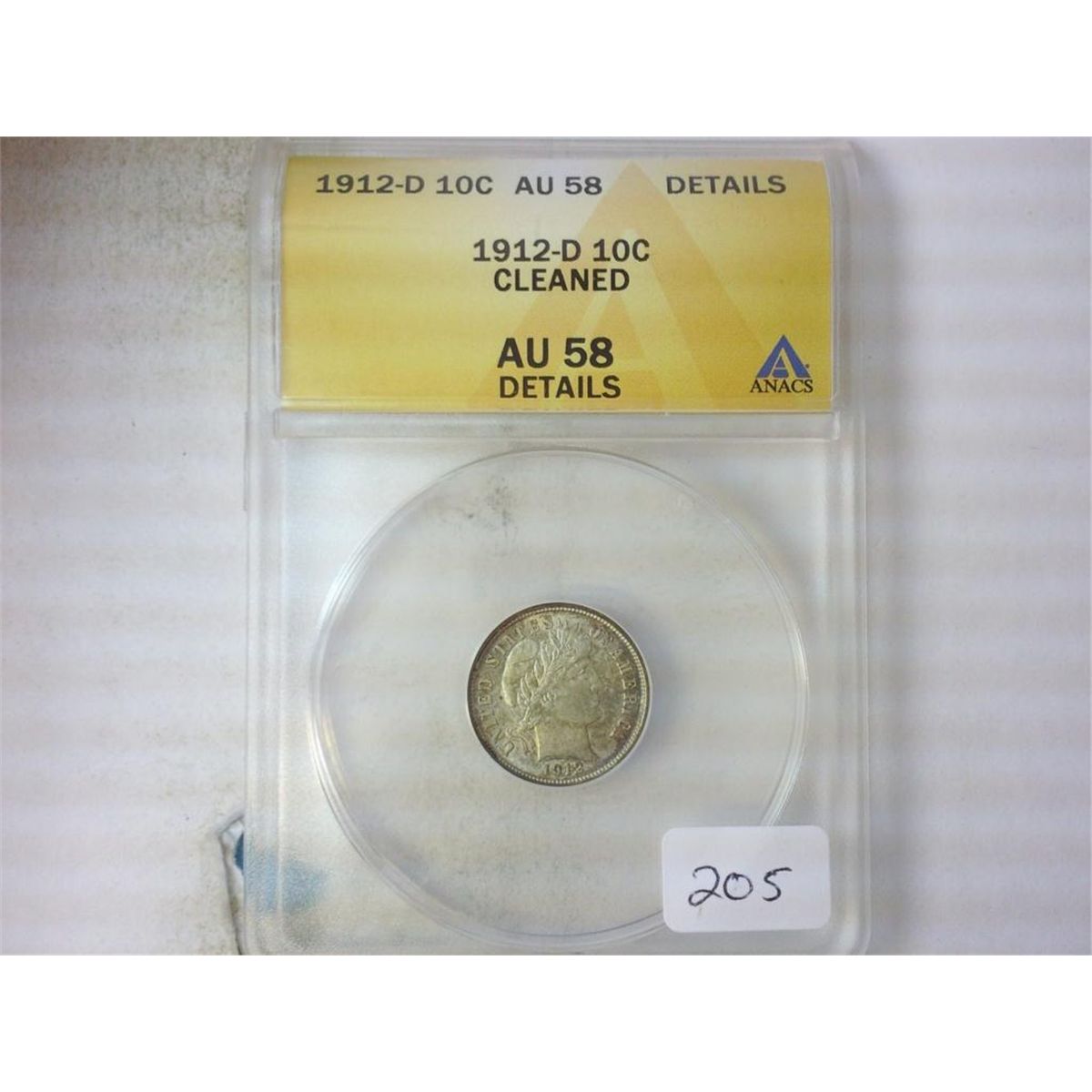 1912-D BARBER DIME ANACS AU58 DETAILS CLEANED