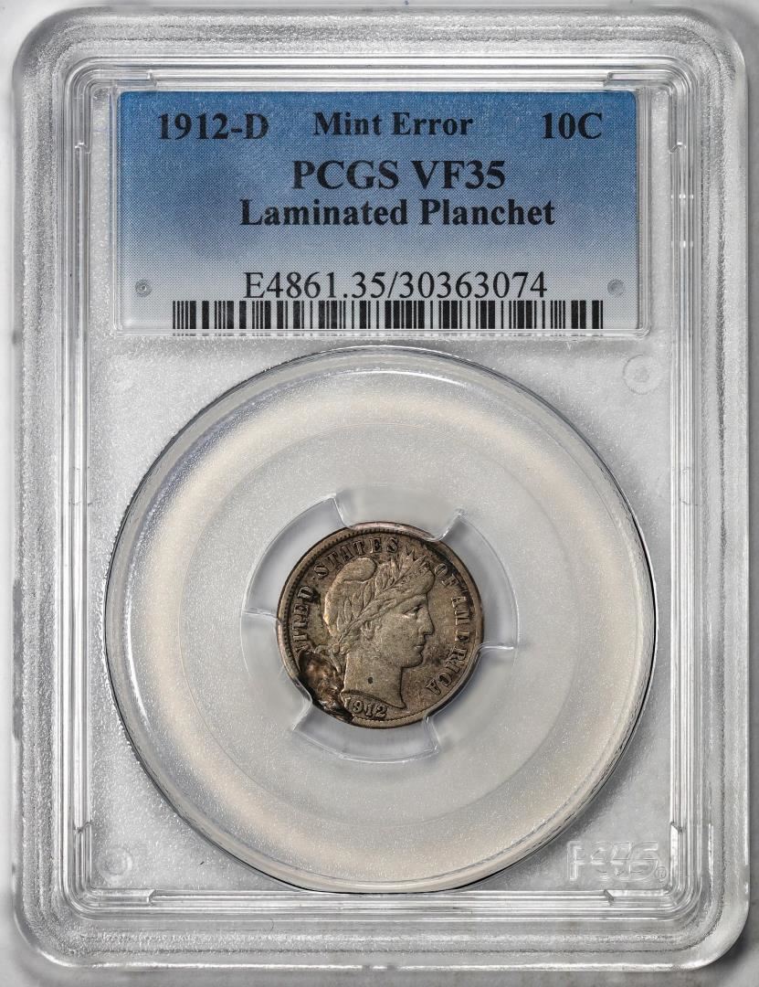 One 1912-D Barber Dime Coin PCGS Mint Error VF35 Laminated Planchet. PCGS Graded.