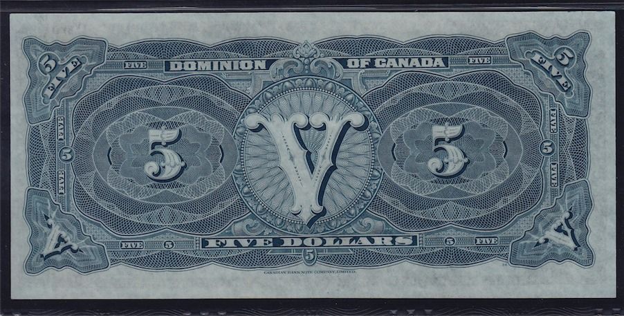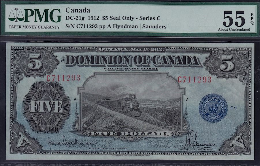 1912 Dominion of Canada $5. DC-21g. Great original note with superb colours, looks UNC. PMG AU-55 EPQ. S/N:C711293/A.