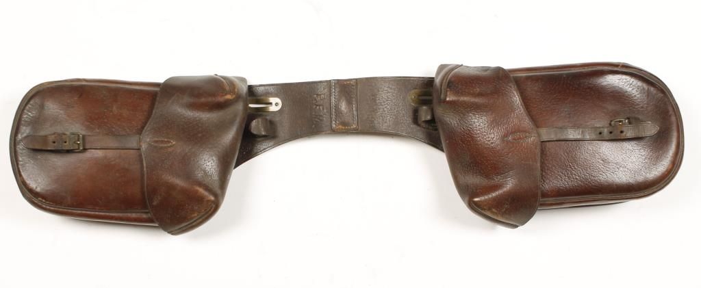 Stamped "P.F.M." Brown molded leather bags with brass fastenings. Shows age with some cracking on straps and some small losses to leather.