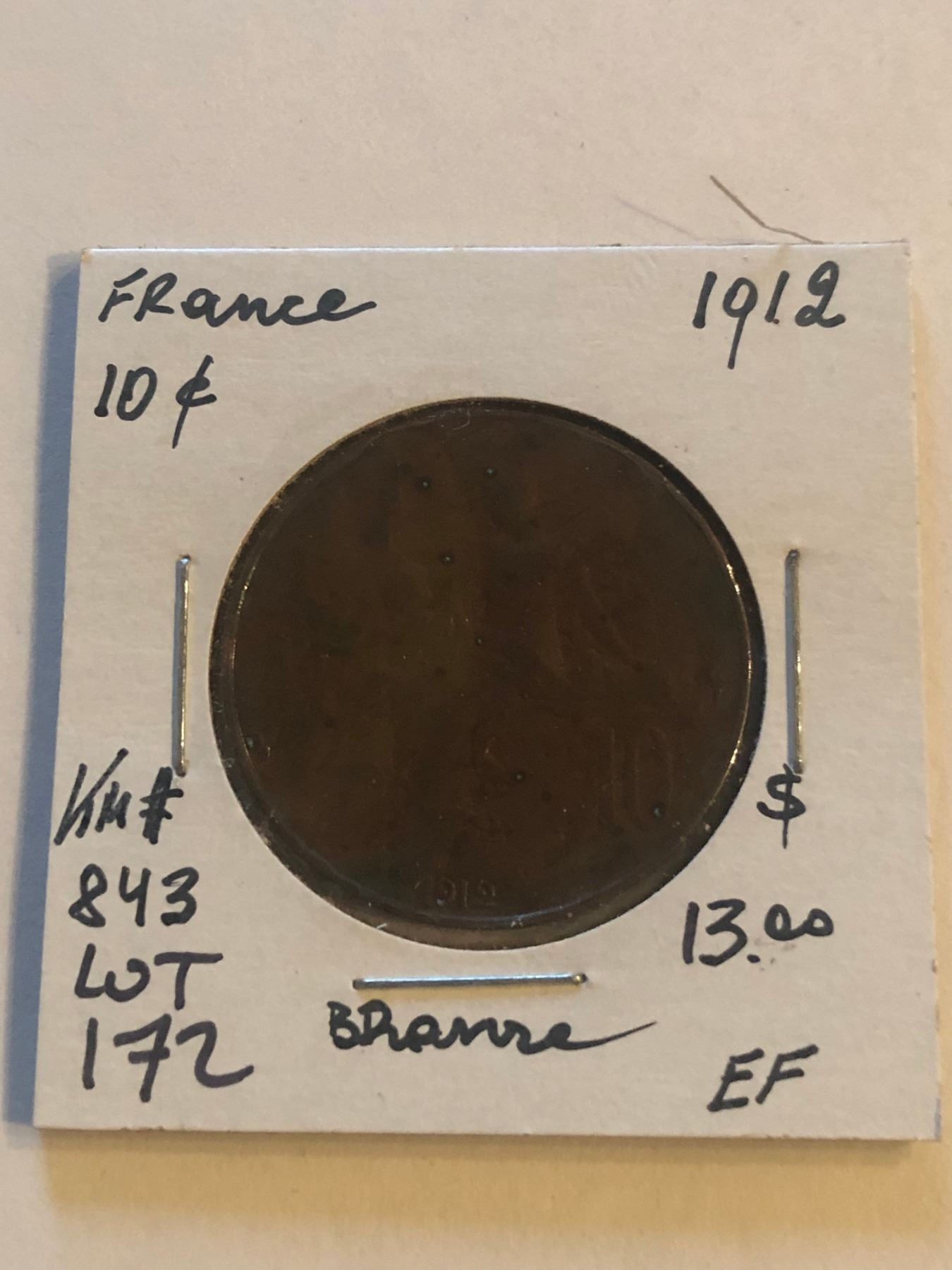 1912 France Large 10 Cents Extra Fine Grade Coin KM 843