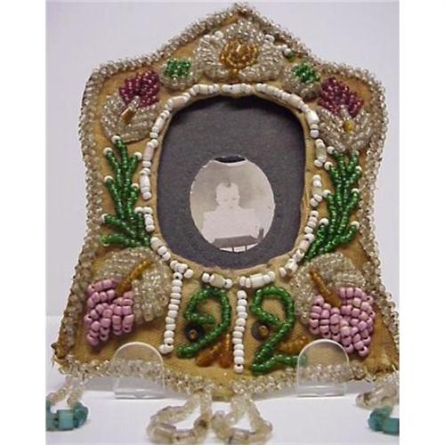 This is a dated turn of the century Iroquois, a hand beaded PHOTO FRAME, with original photo of a baby. Great design and a beatifl frame!! So much attention has been given in the making of the detail of this handsewn beaded cushion, displaying wonderful colored beads that are all hand sewn and is in very good condition, but for a missing fringe on the left corner,and that is to be expected with anything that has survived over 100 years it wll be easy to repair.The back of this pincushion is a beige cotton with some color loss.This is the heirloom item you can pass down through the generations. What a spectacular addition to one's antique beadwork collection.Thank You for looking!