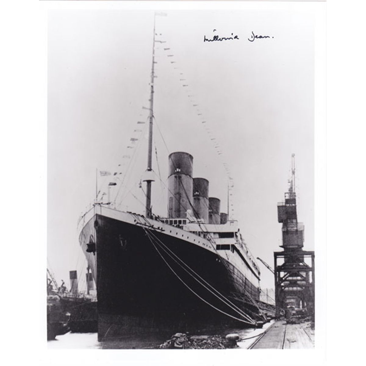A photograph of RMS Titanic signed by Millvina Dean, the last remaining survivor of the sinking of the ship, who passed away in 2009. At 2 months and 27 days of age, she was also the youngest passenger on board the ship. With certificate of authenticity.