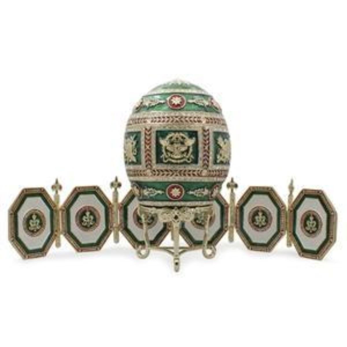 1912 Napoleonic Russian Faberge Egg with Picture Frames Peter Carl Faberge is the world's most famous jeweler who created eternally original pieces of art. The series of Easter eggs created by Faberge for the Russian Imperial family, from 1885 through to 1916, is regarded as the greatest and most enduring achievement. The Faberge Easter eggs are certainly the most celebrated and inspiring of all his works of art, inextricably bound to the Faberge name and legend. They are also considered as the last great commissioned series of objects ofart. You'll love the elegance of this green green hued, Easter egg. A graceful detachable display stand and set of picture frames come with this beauty. Fashioned from fine pewter. Then it is hand enameled by our skilled artisans. This sparkling egg is adorned with clear crystals and high-polished enamel with golden trim. It opens on a hinge and has a magnetic closure to keep the box securely shut. The piece also comes in a beautiful gift box. Features:6.5 Inches Tall X 3.5 Inches Diameter, Pewter, Enamel, 480 Crystals Hand Crafted, 3 lbs Padded Satin Lined Gift Box.