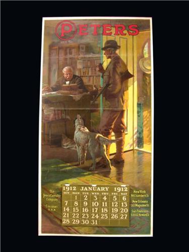 1912 Peters Cartridge Co. Calendar, original bands top and bottom, full pad. Entitled The Tempter, depicting hunter holding pipe. Framed and matted. Some creasing otherwise excellent original condition. Image 14 X 27 inches.