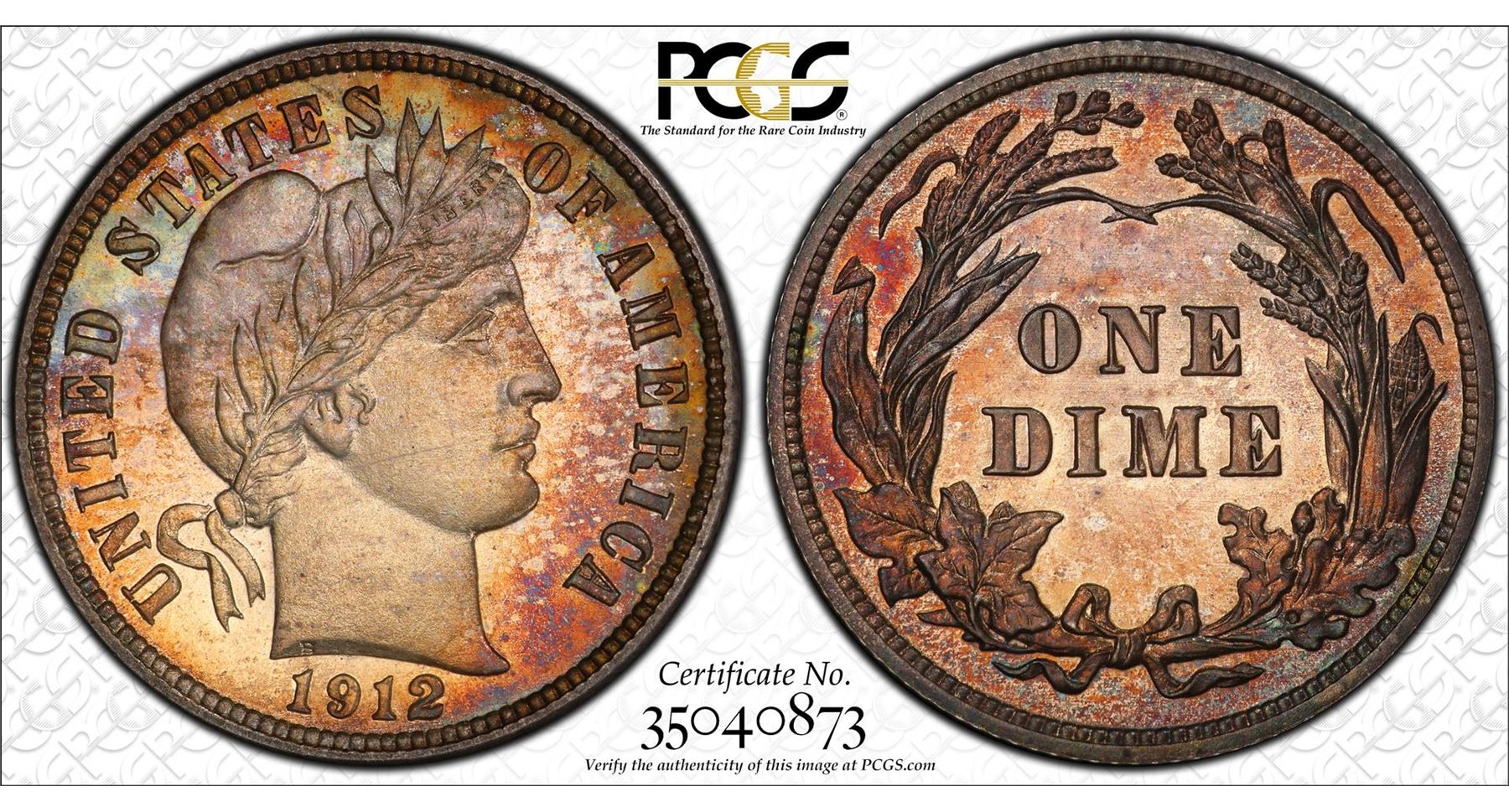 One 1912 Proof Barber Dime Coin PCGS PR65 Amazing Toning. PCGS Graded.