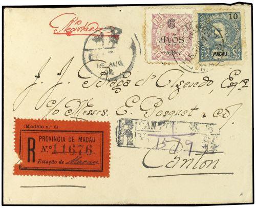 1912 Registered envelope to CANTON bearing 10 avos green and 6 on 10 avos mauve (SG 120,143) tied by MACAU datestamp with registered label and boxed hand-struck CANTON (China) registered applied on arrival. Very fine and attractive item.