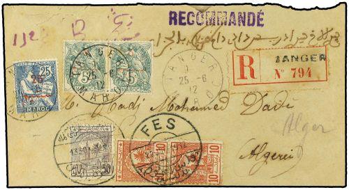 1912 Registered envelope to NORTH AFRICA bearing Maroc Postes Cherifiennes 10 mill red (pair) (Yvert 4) and 50 mill grey (Yvert 6) tied by bilingual FES datestamp sent registered via Tangier with French Maroc 5 on 5 cents green (pair) (Yvert 28) and 25 on 25 cents blue (Yvert 32) tied in transit by TANGER datestamp with registered label ALGER arrival on reverse. A superb mixed franking.