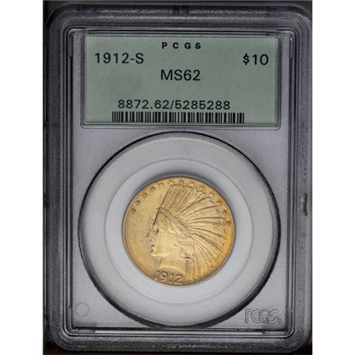 1912-S $10 MS62 PCGS. A softly struck and somewhat sat