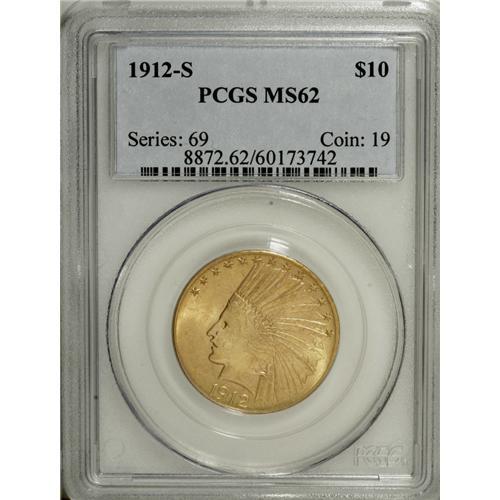 <B>1912-S $10 MS62 PCGS.</B></I> Among the scarcest Saint-Gaudens eagle issues, with few survivors from an original mintage of 300,000 pieces. The glowing, slightly satiny amber-gold surfaces display a number of tiny abrasions, though the well-defined devices are relatively clean.<BR><BR><b>Shipping:</b> Coins & Currency (<a target="_blank" href="http://www.heritageauctions.com/common/shipping.php">view shipping information</a>)