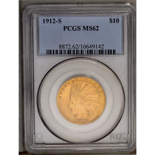 <B>1912-S<$10> MS62 PCGS.</B></I> This is a scarce date as indicated by the limited mintage of just 300,000 coins. Both sides have frosty luster with hints of pink toning over light yellow color.