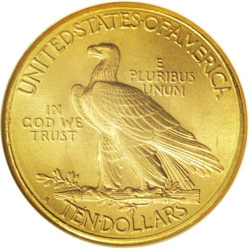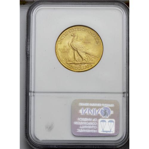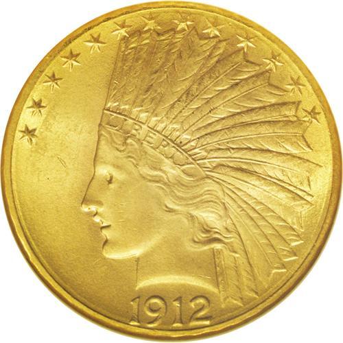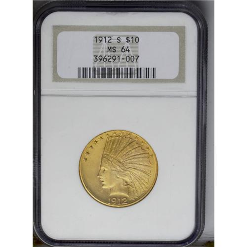 <B>1912-S<$10> MS64 NGC.</B></I> The 1912-S is a very challenging issue to locate with good eye appeal in any grade. This piece has the usual fine-grain surfaces with thick mint frost and a pronounced green-gold tinge. Sharply defined throughout; a few small abrasions and luster grazes keep this coin from an even higher grade. Census: 29 in 64, 5 finer (6/06).