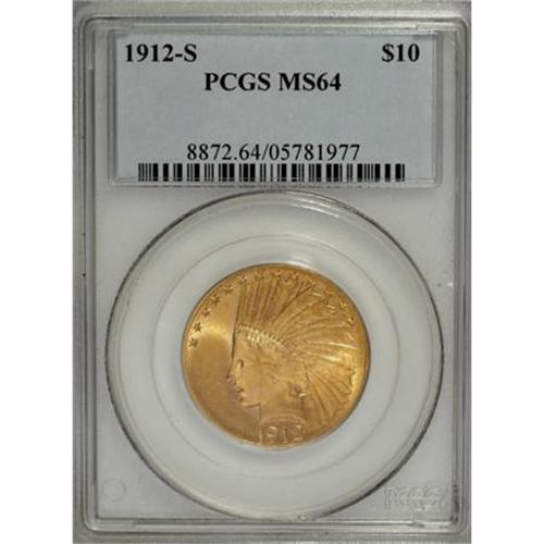 <B>1912-S $10 MS64 PCGS.</B></I> A number of years ago, David Akers wrote that, "high grade and attractive...and 1912-S eagle" are almost mutually exclusive terms. We offer here a coin that defies that pronouncement. The surfaces display rich golden patina intermixed with hints of deep red color on each side that give this piece a level of eye appeal that is seldom seen on a '12-S. The surfaces show the usual fine-grain texture common to coins from this decade, and there are only a few reportable abrasions on the cheek and in the reverse field. Population: 39 in 64, 8 finer (3/08).<BR><BR><B>Coin Engraver:</B> Augustus Saint-Gaudens<BR><BR><b>Shipping:</b> Coins & Currency (<a target="_blank" href="http://www.heritageauctions.com/common/shipping.php">view shipping information</a>)